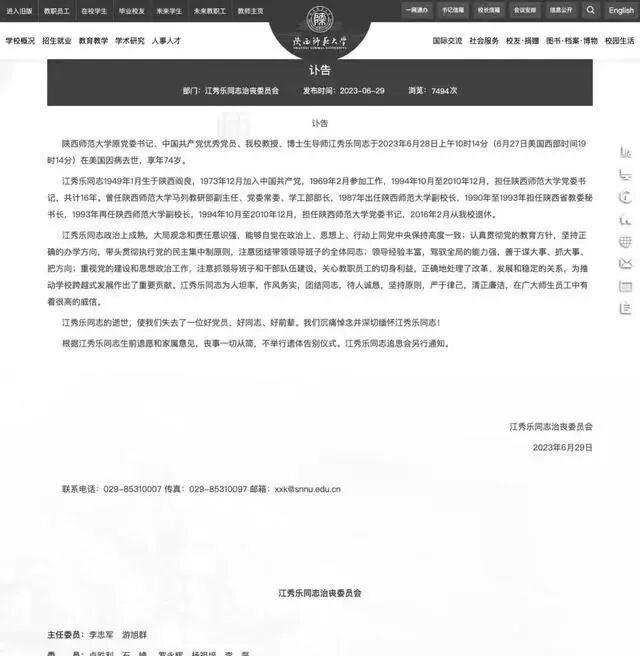 6月29日,“江秀乐同志治丧委员会”在陕西师范大学官网首页发布讣告: